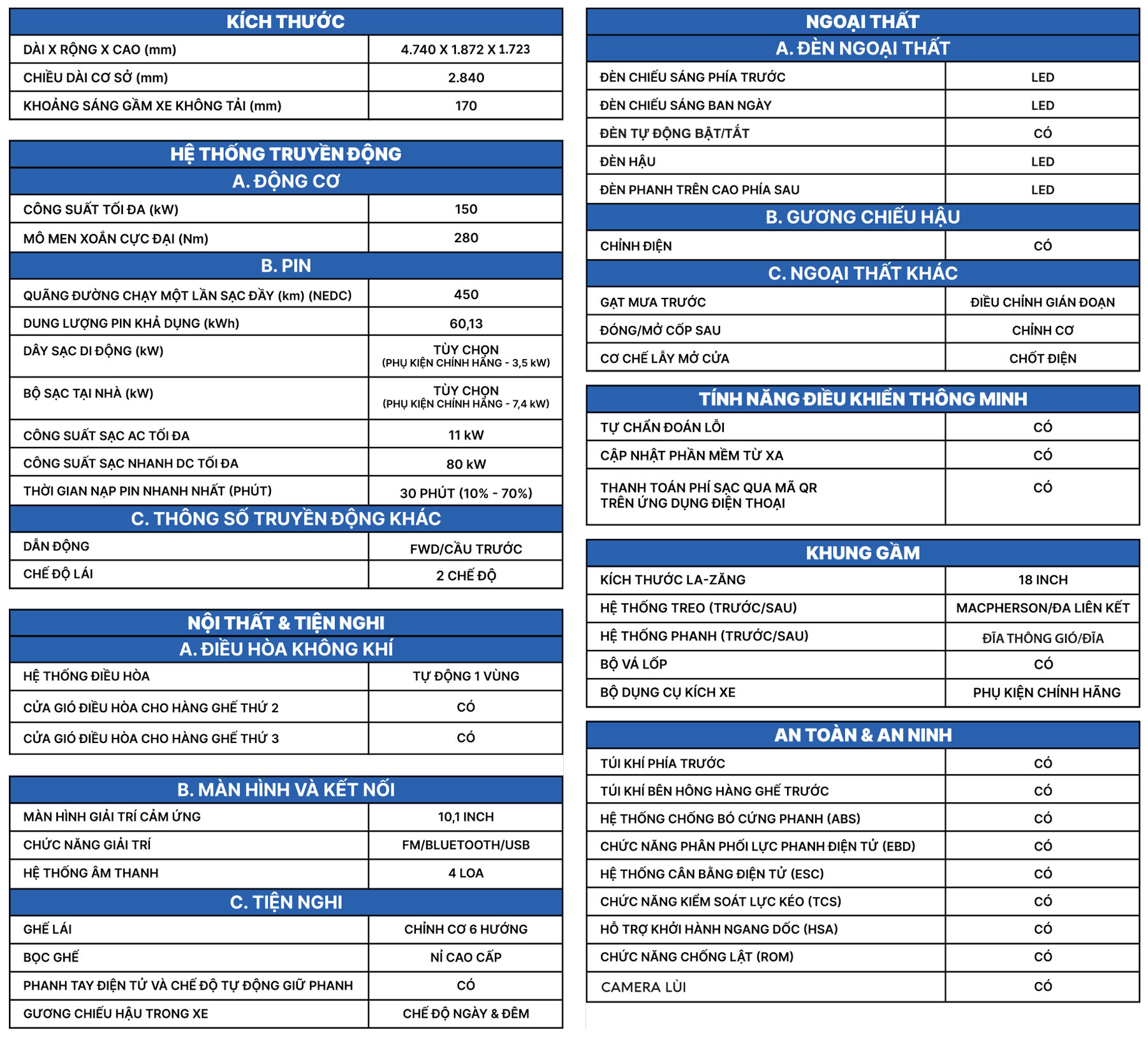 Quãng đường lên tới 450 km chỉ trong một lần sạc (chuẩn NEDC), đủ để đáp ứng mọi kế hoạch mà không lo gián đoạn. Sạc nhanh DC từ 10% lên 70% trong 30 phút, sẵn sàng tiếp tục hành trình ngay lập tức