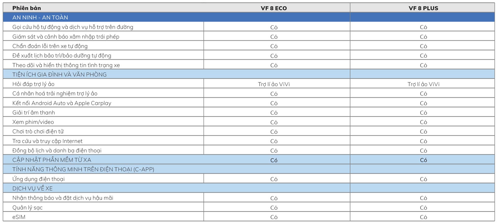 VinFast VF 8 với thiết kế mới sang trọng và công nghệ vượt trội. Với nhiều điểm nổi bật: ngoại thất nhiều màu, công nghệ trợ lý ảo Vivi 2.0 mới, ADAS và VF Connect. VinFast VF 8 có hai tùy chọn là phiên bản VF 8 Eco và phiên bản VF 8 Plus, trong đó phiên bản VF 8 Eco được trang bị động cơ điện có công suất 350 mã lực, đi được quãng đường 562km/lần sạc đầy, trong khi phiên bản VF 8 Plus có sức mạnh lên tới 402 mã lực, đi được quãng đường 457km/lần sạc đầy.